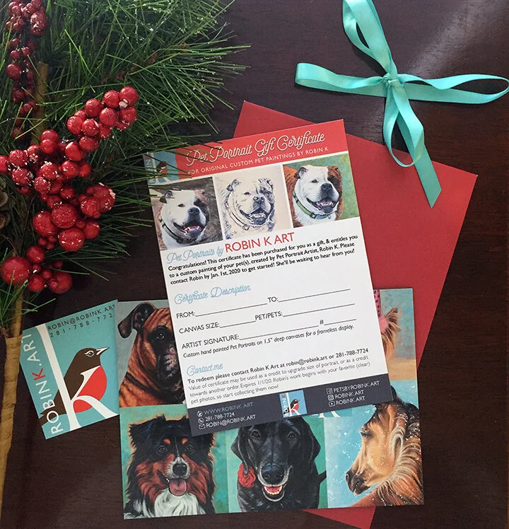Didn’t get your Pet Portrait by Robin K ordered in time for the Holidays? No worries- I got you covered Get them a Gift Certificate!